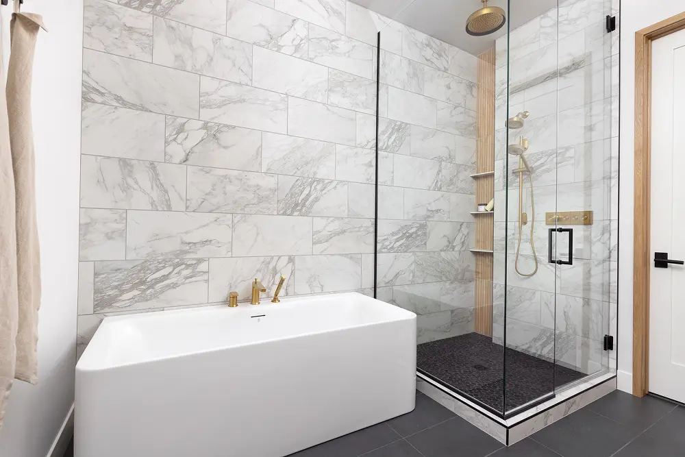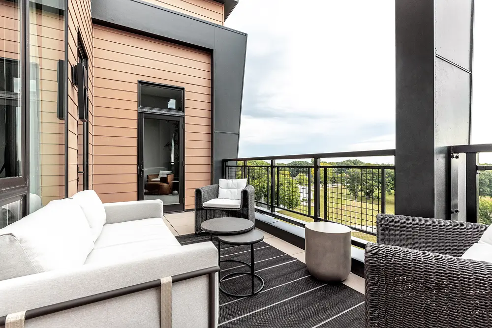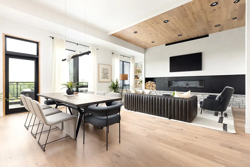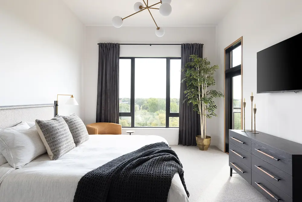 Perched on the fifth floor with sweeping views of the river, this luxury condo fit-up is a refined study in contrast and clean modernity. Rift-sawn white oak is paired with matte black cabinetry to ground the home in warmth and intention. A custom steel-paneled fireplace with lime-washed walls offers architectural depth, while the large-scale quartzite island—with waterfall ends—anchors the kitchen in natural drama. Every detail, from the oversized windows to the tailored millwork, was designed to elevate convenience into quiet luxury. This is modern living, honed and heightened.